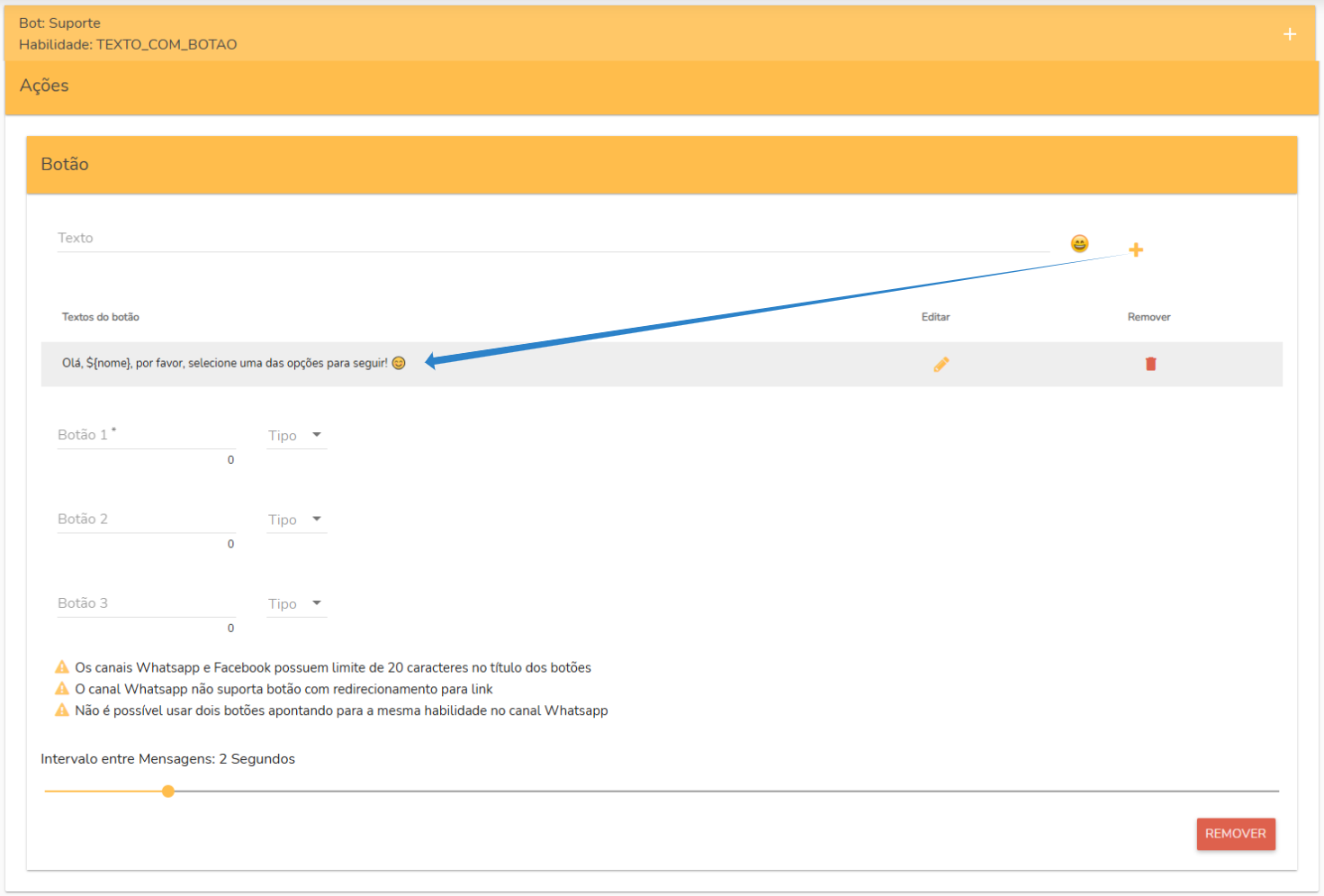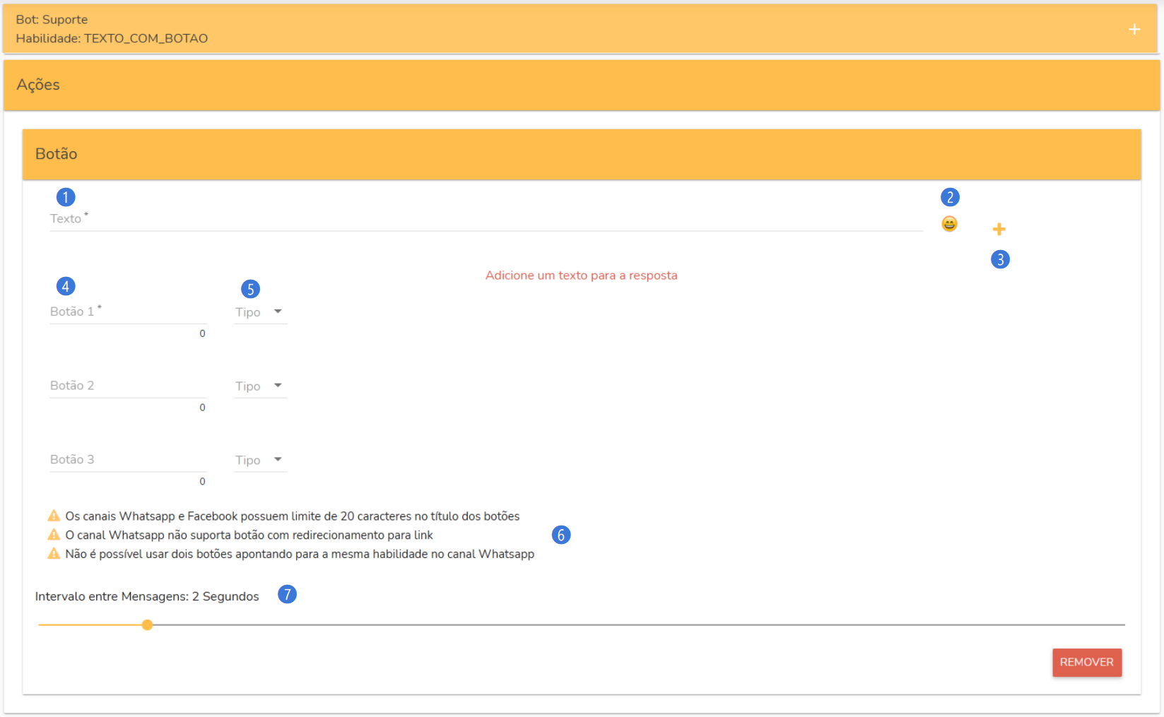 Neste campo, você pode escrever mensagens personalizadas para o bot enviar ao usuário.